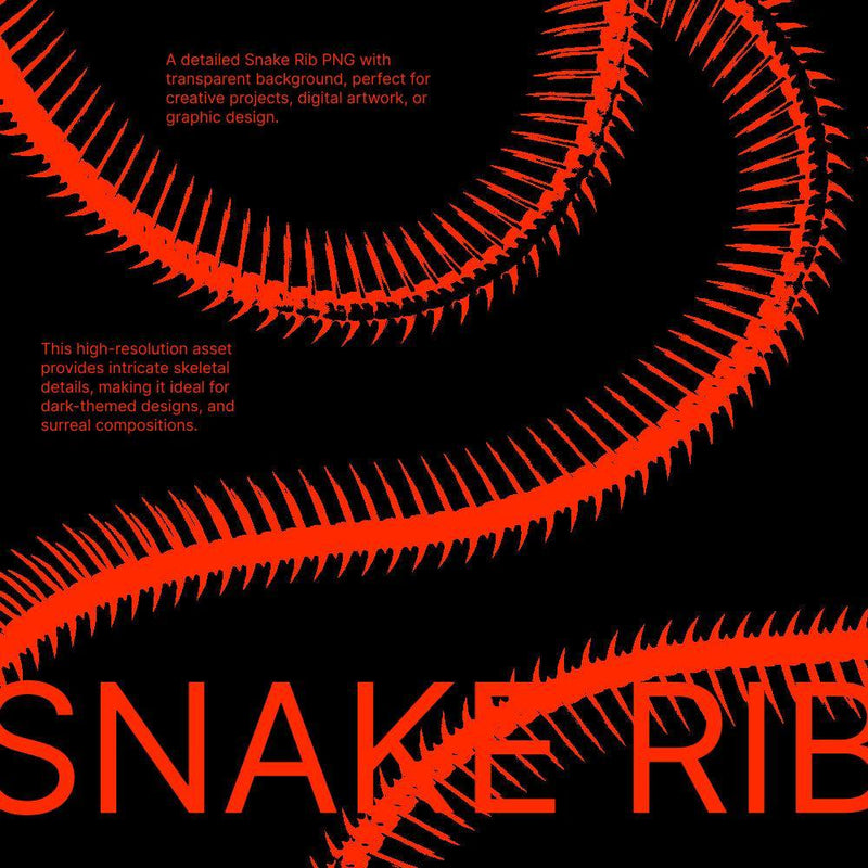 The Snake Rib is a high-resolution PNG asset featuring detailed skeletal structures with a transparent background, measuring 3000 x 3000 pixels. It includes 15 PNG files with 3 different textures, compatible with Photoshop and Affinity Photo, making it suitable for various digital projects.