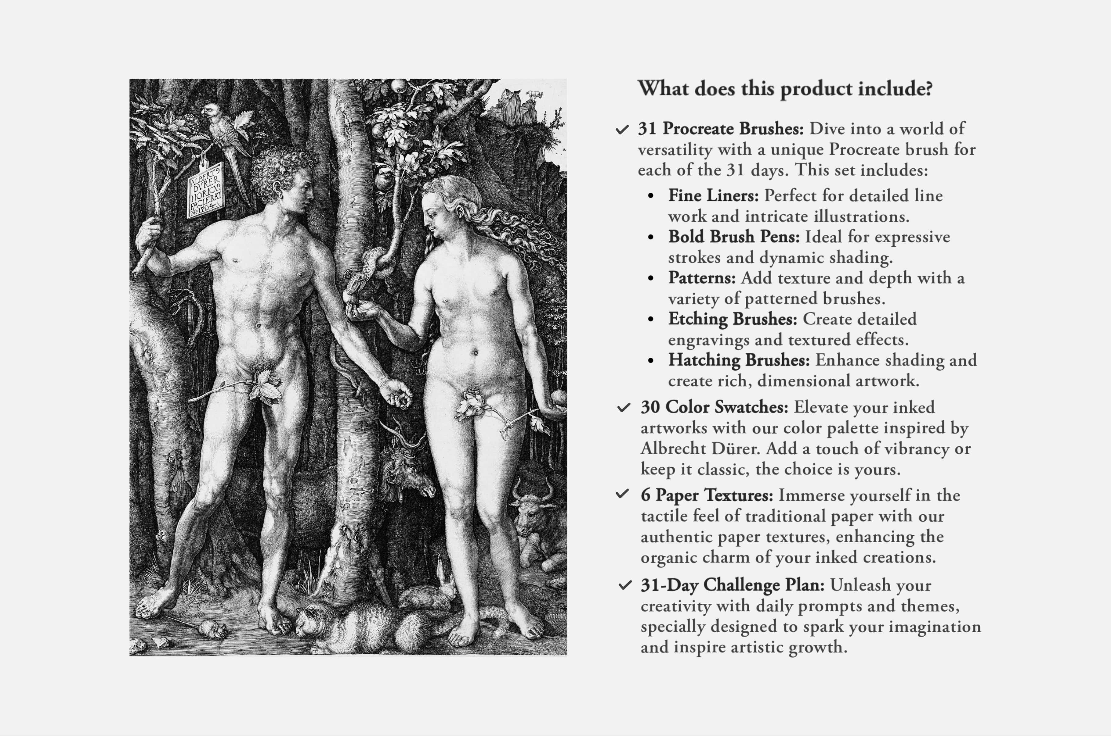 The Inktober Challenge Procreate Kit includes 30 color swatches, 31 brushes, and 6 paper textures designed for use with the Procreate app on iPad. It also features a 31-day Inktober Challenge Plan for 2024 and offers 24/7 support.