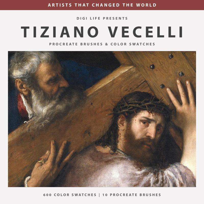 The Titian Procreate Kit includes 600 color swatches and 10 brushes inspired by Tiziano Vecelli's paintings, designed for illustrators and graphic designers. It also provides a Spotify playlist link and 24/7 support, ensuring compatibility with Procreate.