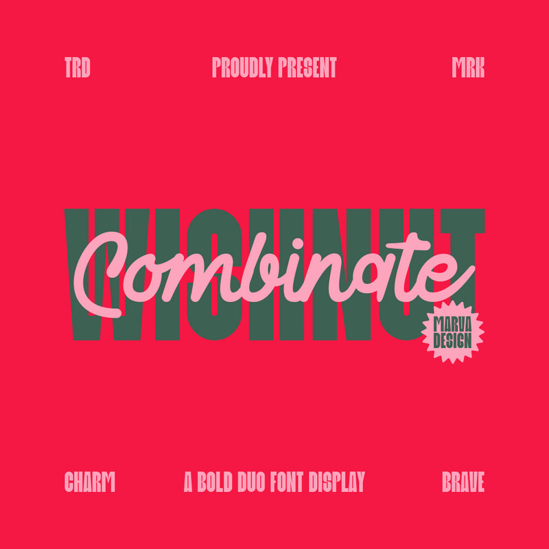 Wishnut is a display font family that includes three styles: Condensed, Condensed Italic, and Script. The Condensed style features tall, geometric letterforms for a modern look, while the Condensed Italic adds a dynamic forward lean, and the Script style offers a smooth, handwritten aesthetic, creating a versatile typeface system suitable for various design projects.