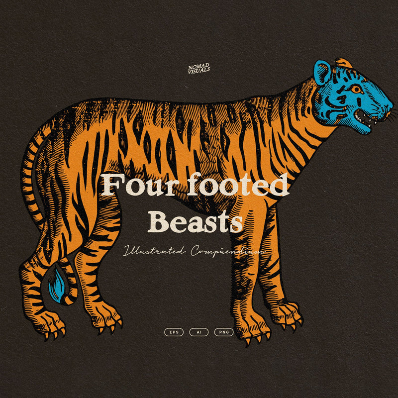 "Four Footed Beasts" is a collection of 132 high-resolution, vectorized illustrations of various animals sourced from a Renaissance-era volume. The set, compatible with multiple design platforms, includes PNG, AI, and PDF files, allowing for easy customization of size and color to fit any design requirement.