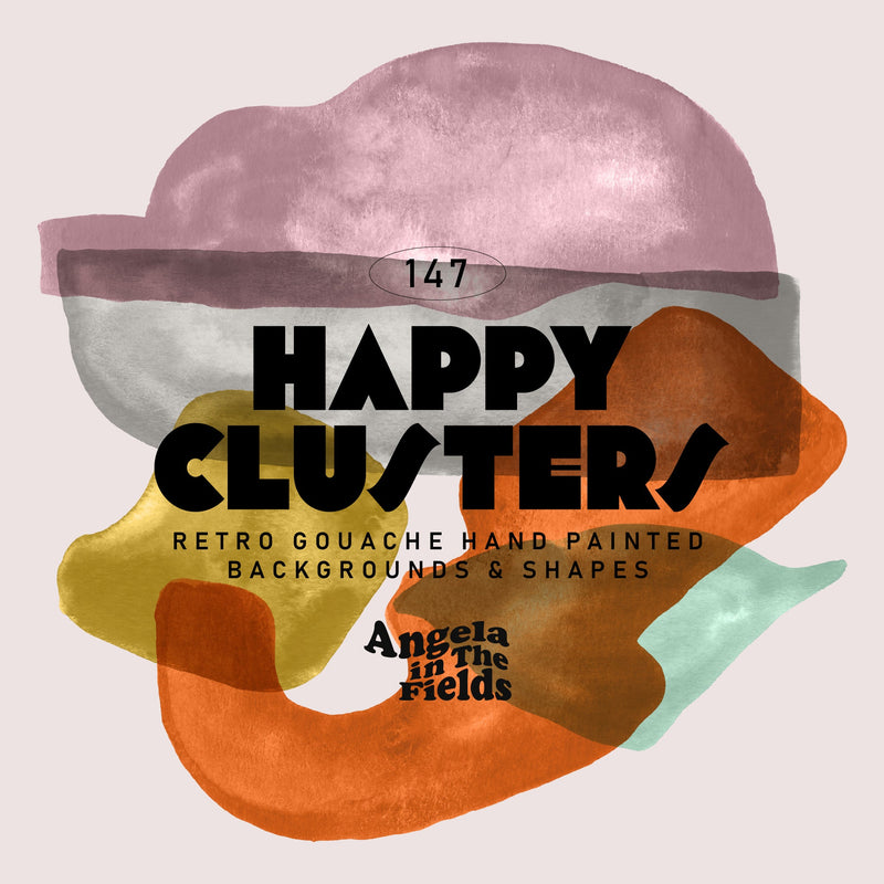 The HAPPY CLUSTERS Gouache Shapes is a collection of over 140 handmade, painted graphics featuring soft abstract shapes in various ratios. The set includes square, 2:3, 3:4, 9:16 ratio graphics, clusters/accents, and single element graphics, compatible with Photoshop, Affinity Photo, Procreate, Sketch, Figma, and Canva.