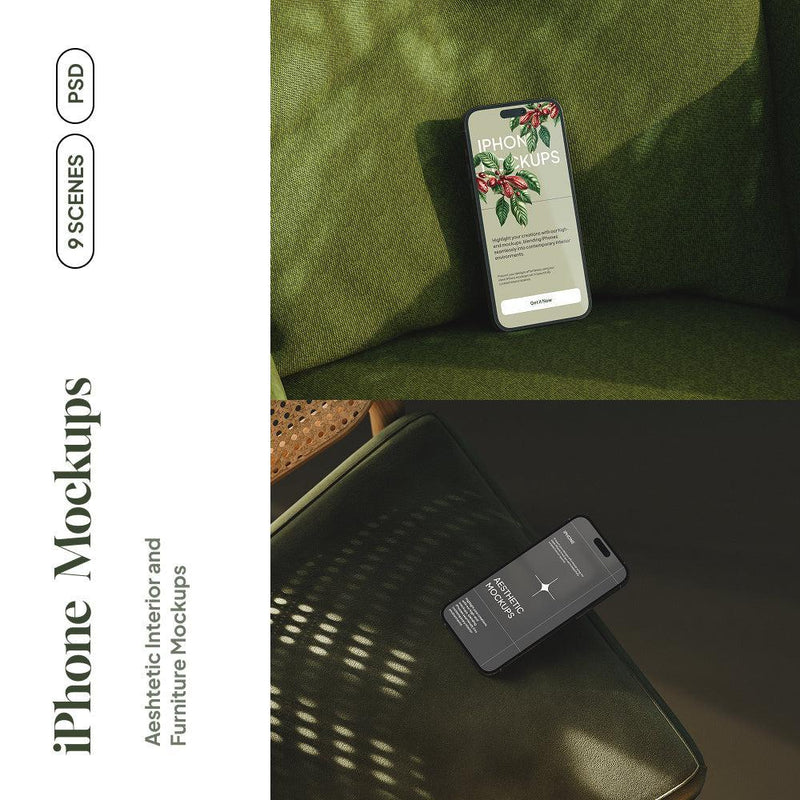 iPhone Mockups in Aesthetic Interior includes nine elegantly styled PSD scenes designed for showcasing app UI, web design, or branding. Each mockup features a resolution of 4000 x 3000 px at 300 dpi, organized layers for easy editing with Smart Objects, and a help file, while model images are not included. Compatible with Photoshop.