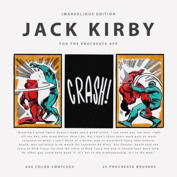 Jack Kirby's Procreate Kit includes 600 color swatches and 25 brushes designed for illustrators, graphic designers, and font designers. Compatible with Procreate, this kit provides a variety of brushes, including pencils, watercolor, and comic-style options, along with 24/7 support.