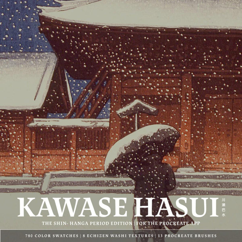 The Kawase Hasui Procreate Kit offers a comprehensive collection for artists, featuring 780 Procreate color swatches, 13 Procreate brushes, and 8 Echizen Washi textures inspired by the works of Kawase Hasui. This kit is designed for use with the Procreate app on iPad and includes a Spotify playlist link and 24/7 support.