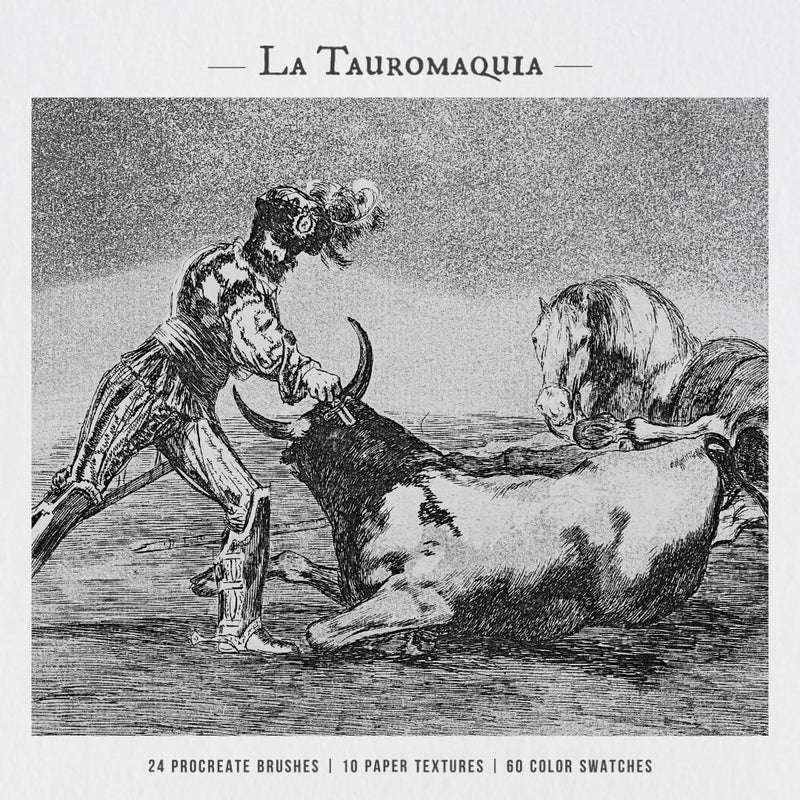 The La Tauromaquia Procreate Kit is inspired by Francisco Goya's series of bullfighting prints and includes 24 Procreate brushes, 60 color swatches, and 10 paper textures, all designed to replicate the aesthetic of Goya's illustrations. This kit is compatible with Procreate and also provides a Spotify playlist link and 24/7 support.