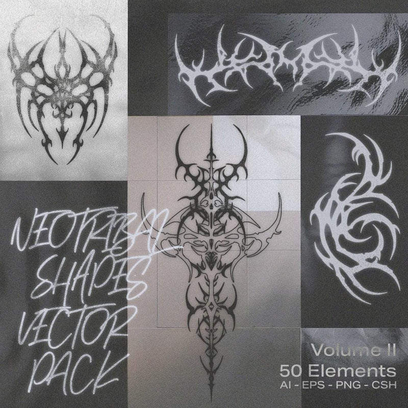 Neotribal Shapes Vol. II is a digital product that includes 57 hand-drawn vector elements, available in AI, EPS, PNG, and CSH formats. The set also features a 3D bevel version of 50 shapes, 6 bonus background textures, and is compatible with various design software like Illustrator, Photoshop, Affinity Designer, and more.