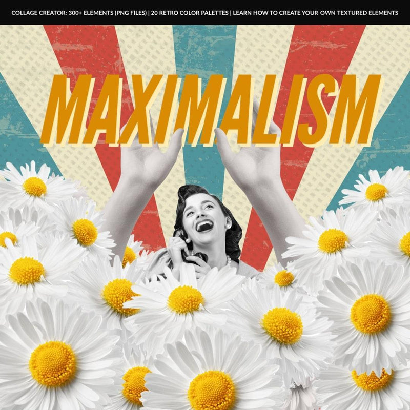 The Maximalist Collage Creator allows users to easily create detailed maximalist collages with over 300 elements and 20 retro color palettes, all provided in high-resolution PNG format. It is compatible with various graphic design applications, and after purchase, users will receive a PDF with a link to download the elements individually from Google Drive.