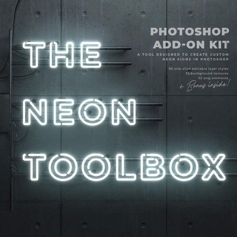 The Neon Toolbox is a Photoshop-compatible tool designed for creating custom neon signs. It offers one-click, fully editable layer styles applicable to text and shapes, high-resolution backgrounds and elements, and a user guide with a tutorial. The package includes 32 background textures, 52 elements, a Neon Photoshop Layer Styles file, a bonus NeonToolbox font, and a retro computer sign.