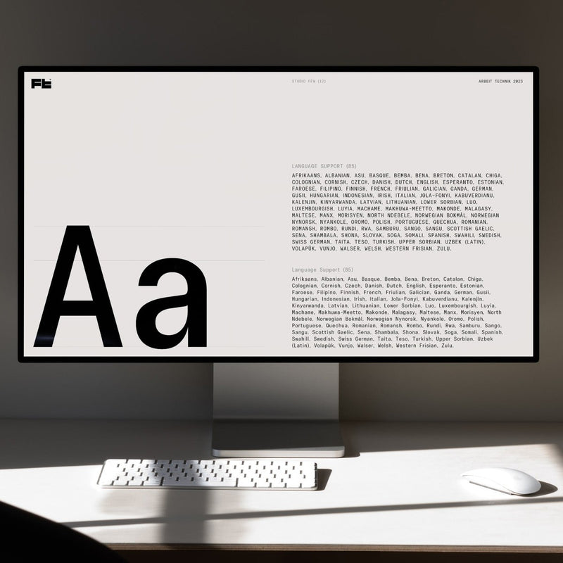 The Arbeit Technik - Full Family is a semi-mono condensed version of the Arbeit Pro typeface, designed specifically for technical drawings and UI applications. It includes a Stylistic Set feature that allows for the removal of the 'mono' style serifs.