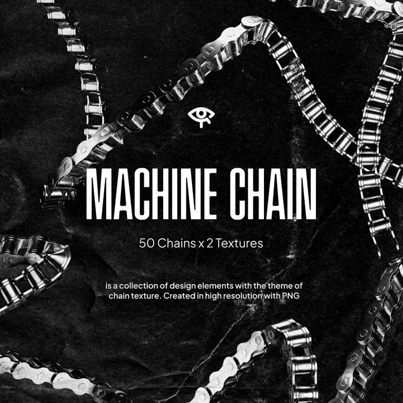 Machine Chain is an asset pack featuring 50 high-resolution chain elements in gold and silver textures, delivered as transparent PNG files. Each file measures 3000 x 3000 px at 72 DPI, making it compatible with design software like Photoshop, Figma, Canva, and InDesign.