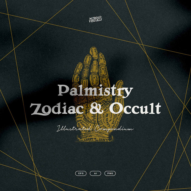Palmistry, Zodiac & Occult is a comprehensive package of 120 illustrations available in both PNG raster and vector formats. The product is compatible with various platforms including Photoshop, Illustrator, Procreate, Canva, Figma, and Sketch, and features a wide range of mystical and astrological symbols suitable for branding, packaging, and design needs.