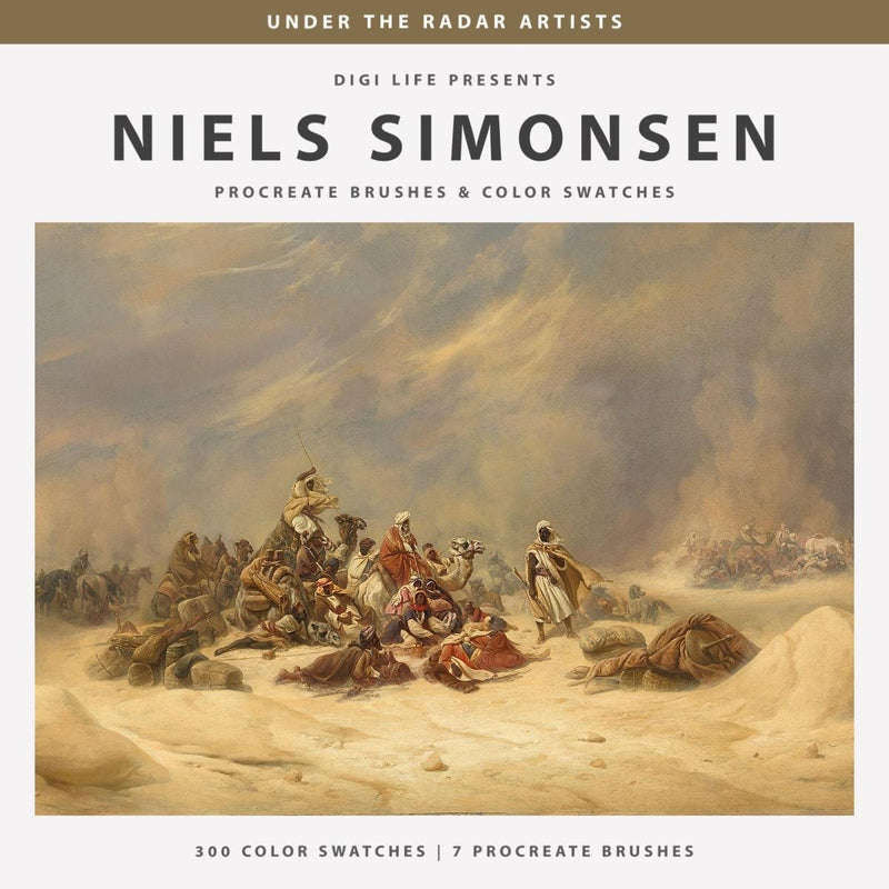The Simonsen Procreate Kit includes 300 color swatches and 7 Procreate brushes designed by Niels Simonsen, tailored for illustrators and graphic designers. It also features a Spotify playlist link and 24/7 free support, all compatible with Procreate.