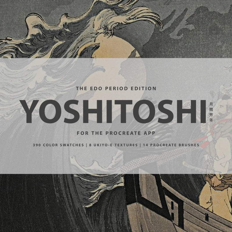 The Yoshitoshi Procreate Kit, Issue 9: The Edo Period Collection, includes 390 Procreate color swatches, 14 Procreate brushes, and 8 Ukiyo-e textures inspired by Tsukioka Yoshitoshi's paintings. Additionally, it features a Spotify playlist link and 24/7 support, all designed for use with Procreate.
