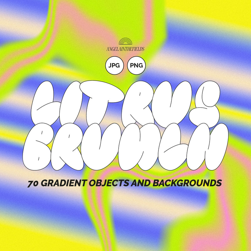 The 90s Citrus Brunch Gradients is a digital graphics pack that revives the late 80s and 90s print style. It includes 75 items: 25 transparent gradient objects, 25 transparent gradient frames, and 25 contrasting gradient backgrounds, compatible with Photoshop, Affinity Photo, Procreate, and Canva.