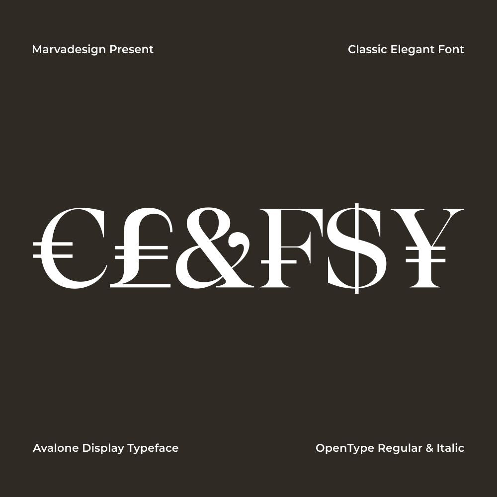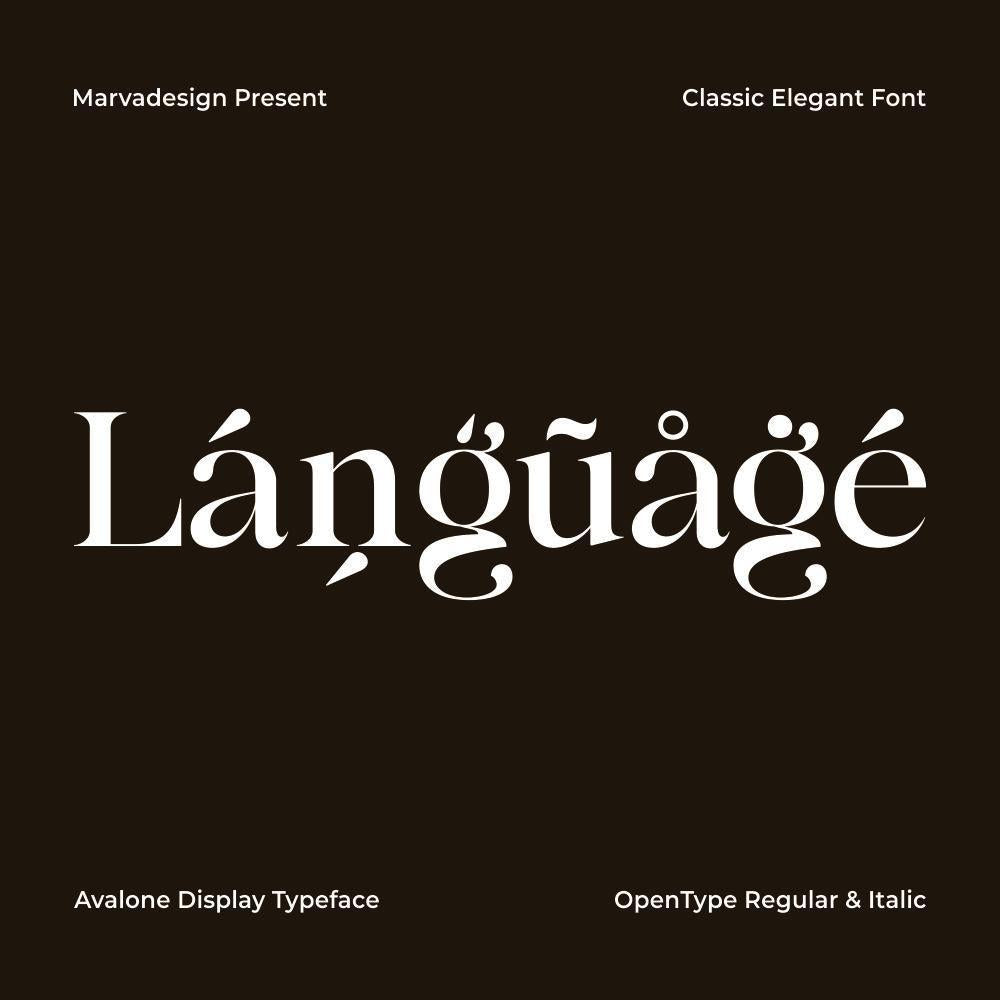 Avalone is a sophisticated typeface available in two styles: Regular Serif and Italic. The Regular Serif style features classic serifs for a traditional look, while the Italic style offers a graceful slant, making Avalone a versatile font suitable for various design projects.