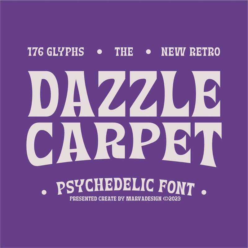 The Dazzle Carpet font is a psychedelic-inspired typeface featuring fluid, wavy letterforms and intricate curves, reflecting the bold typography of the 1960s and 1970s. Its unique structure and ornamental details provide a visually striking effect suitable for various design projects.