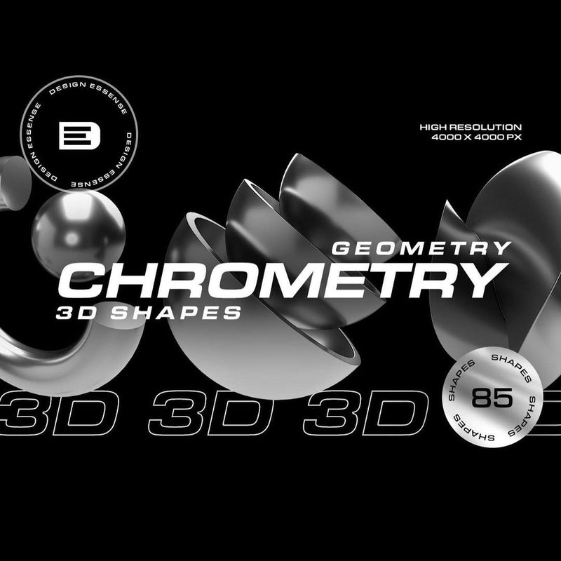 The Chrome Geometrical 3D Shapes is a set of 85 high-quality, geometric metal 3D shapes, suitable for various creative projects. These shapes come as PNG files with a transparent background, high resolution of 4000 x 4000 px, and 300 DPI, compatible with platforms like Photoshop, Affinity Photo, Procreate, Sketch, Figma, and Canva.