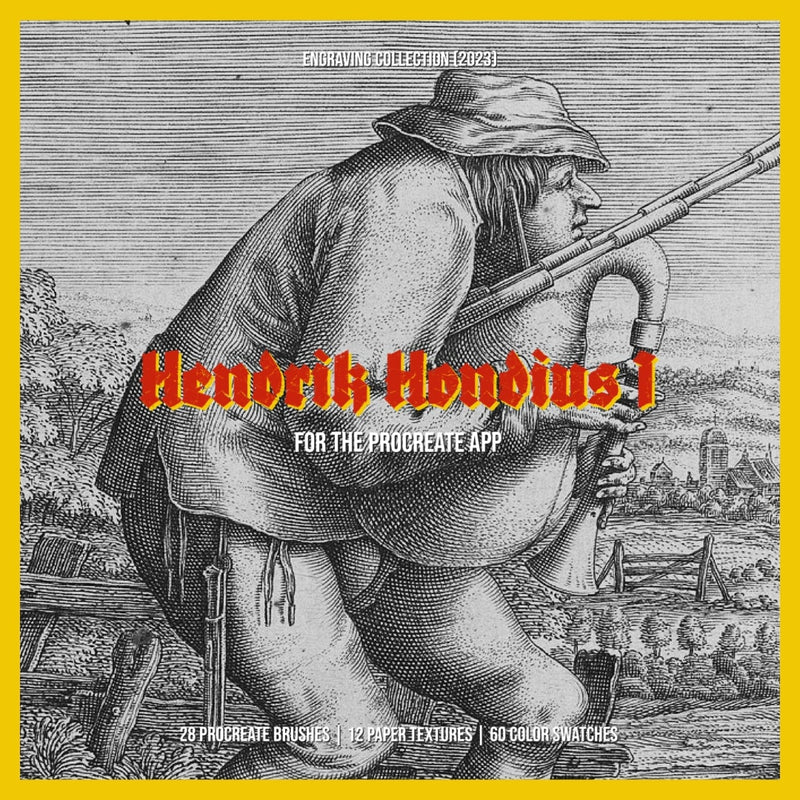 The Hendrik Hondius I Procreate Kit features 28 Procreate brushes, 60 color swatches, and 12 paper textures inspired by the engravings of Hendrik Hondius I. This kit is designed for use with Procreate and includes high-resolution textures, along with a link to a curated music playlist for a creative experience.
