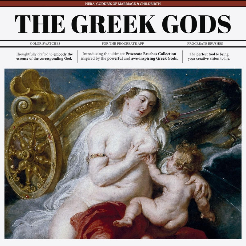 The Hera Procreate Kit, part of The Greek Gods Collection, includes 150 color swatches inspired by Hera, the Goddess of marriage and childbirth, along with 11 Procreate brushes and 1 paper texture. This kit is compatible with Procreate and offers 24/7 free support.