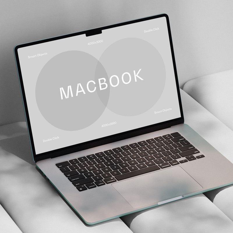 The Modern MacBook Air Mockup is a high-quality PSD file designed for Photoshop. It features a photorealistic MacBook Air device, a velour couch texture, and a shadow overlay, all customizable in color. The file dimensions are 4000x3000px at 300 dpi, and it includes Photoshop Smart Object layers for easy drag and drop designs.