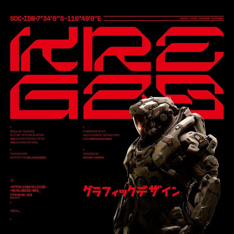 The NCL KREGAS is a cyberpunk futuristic techno mecha font featuring 4 distinct styles: Regular, Slanted, Outline, and Outline Slanted. It comes with 440 glyphs for each style, totaling 1760 glyphs, and supports 85 languages. The font package includes True Type Font (TTF), Open Type Font (OTF), and Web Open Format (WOFF1 & WOFF2) files. It is compatible with various graphic software like Adobe Illustrator, Adobe