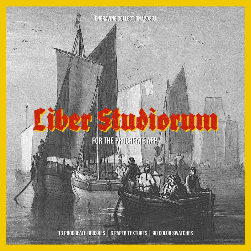 The Liber Studiorum Procreate Kit includes 13 Procreate brushes, 90 color swatches, and 6 paper textures, designed to replicate various traditional illustration techniques such as etching, hatching, and sketching. This kit is compatible with Procreate and also provides a link to an Apple Music and Spotify playlist, along with 24/7 support.