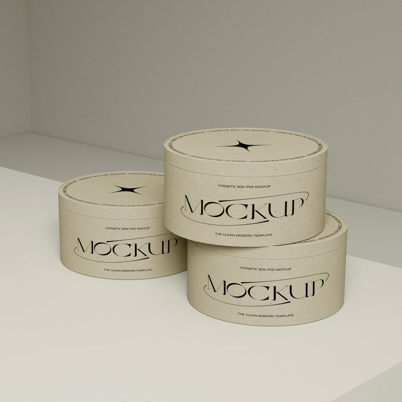 Ideal for packaging design and branding in the beauty and cosmetics industry. Perfect for creating realistic mockups of round cardboard boxes for product presentations, promotional materials, and e-commerce displays, ensuring a professional and visually appealing showcase of your designs.