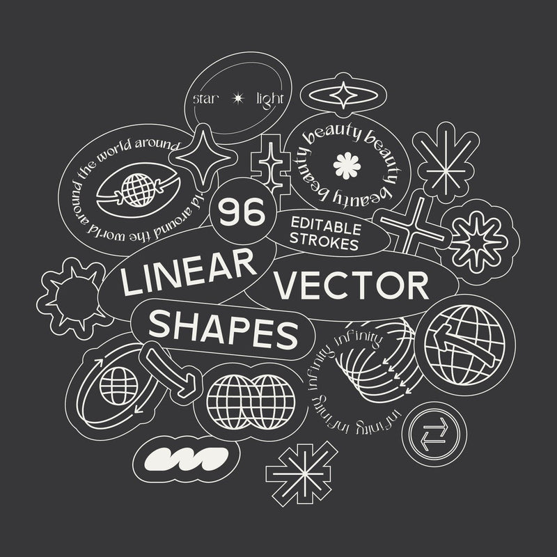 The "96 Linear Vector Shapes - Part 1" is a collection of 96 high-quality geometric shapes including popular graphic elements like wireframe planets, arrows, vortex, stars, and other abstract shapes. The set comes in various formats (AI, EPS, PDF, CSH, ABR, PSD, SVG, PNG, JPG) and is compatible with major graphics editing software, allowing for easy editing of stroke weight, transformation, and recoloring of each shape.