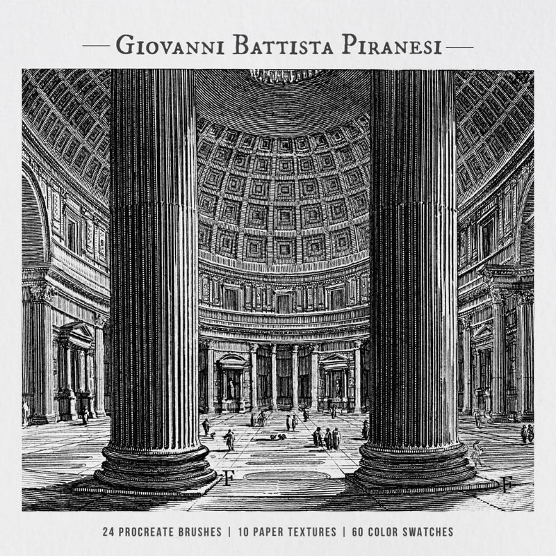 The Giovanni Battista Piranesi Procreate Kit includes 24 Procreate brushes, 60 color swatches, and 10 paper textures, all inspired by the works of the Italian artist known for his etchings of Rome. This kit is compatible with Procreate and also provides a Spotify playlist link and 24/7 support.