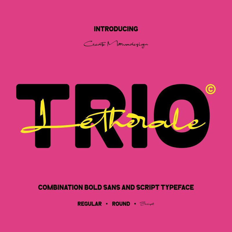 Letherale is a modern typeface that features a trio of bold, rounded script sans serif styles, designed by Marvadesign. This versatile typographic system combines a strong sans serif base with stylized handwritten elements, offering a dynamic and clear visual appeal suitable for various design applications.