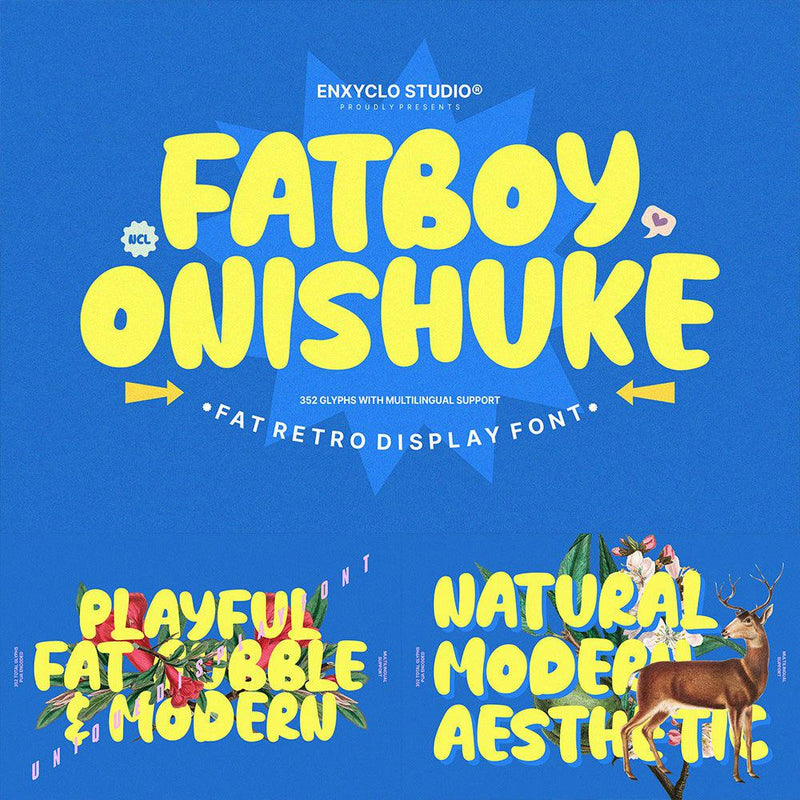 The NCL Fatboy Onishuke is a bold, playful, fat retro display font that's designed for both large and small point sizes. It comes in True Type Font (TTF), Open Type Font (OTF), and Web Open Font Format (WOFF1 & WOFF2), and includes 352 glyphs, uppercase and lowercase letters, numerals, punctuation, symbols, and ligatures. It also supports multiple languages.