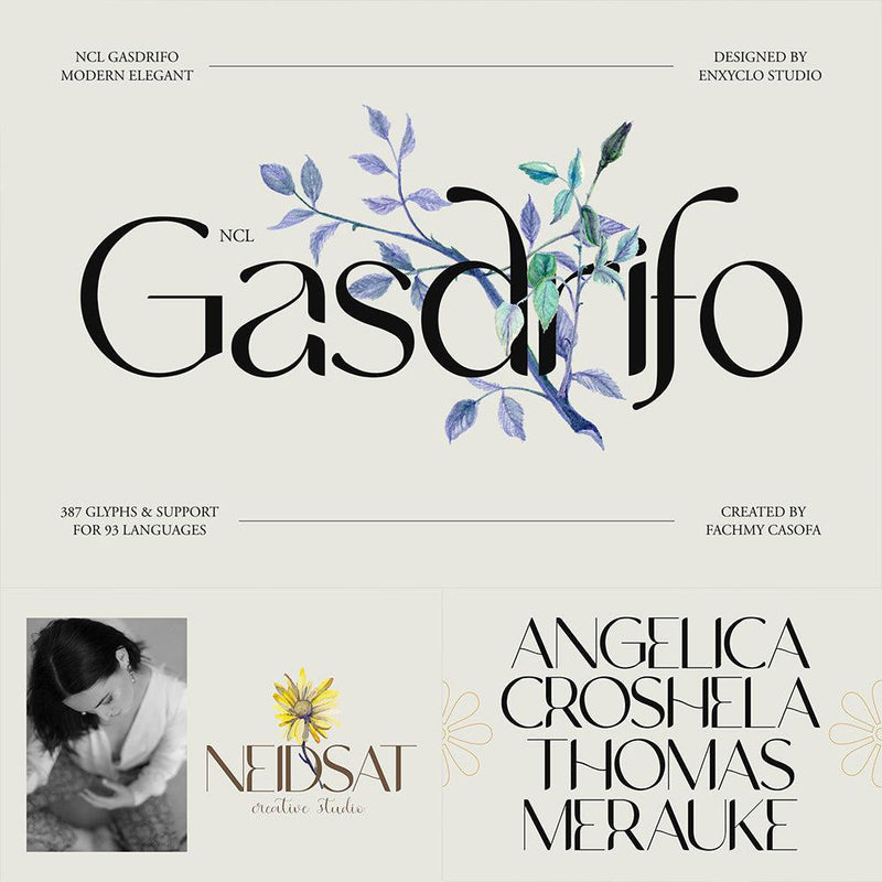 The NCL Gasdrifo is a modern elegant font that includes 387 glyphs, uppercase and lowercase letters, numerals, punctuation, and symbols. It supports 93 languages and comes in True Type Font (TTF), Open Type Font (OTF), and Web Open Format (WOFF1 & WOFF2).