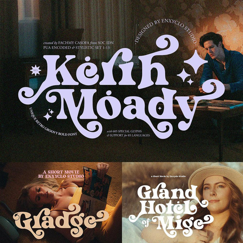 The NCL Kerih Moady is a retro groovy bold font that is designed for use in large and small point sizes. It includes True Type Font (TTF), Open Type Font (OTF), and Web Open Format (WOFF1 & WOFF2), and contains 605 glyphs, uppercase and lowercase letters, numerals, punctuation, symbols, special ligatures, and stylistic sets. This font supports 85 languages.