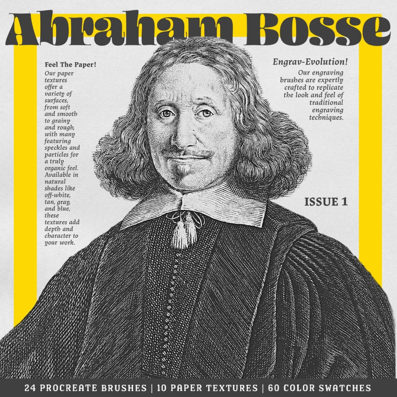 The Abraham Bosse Procreate Kit includes 24 Procreate brushes, 60 color swatches, and 10 high-resolution paper textures, designed to replicate the engraving techniques of the Baroque period. This kit is compatible with Procreate on iPad and features a Spotify playlist link for an immersive sketching experience.