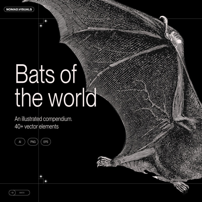 "Bats of the World" is a collection of over 40 detailed illustrations of various bat species, available in high-resolution PNG, EPS, and AI formats. This product provides a comprehensive visual resource on the diversity and unique characteristics of bats, suitable for use in compatible software like Photoshop, Illustrator, Procreate, Canva, Indesign, and Affinity Designer.