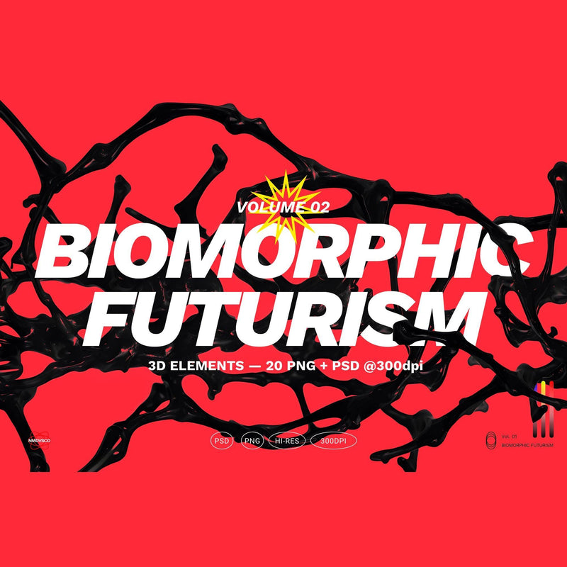 Biomorphic Futurism - Vol 02 is a collection of 20 high-resolution PNG 3D elements, each measuring 4500x6000px at 72dpi, featuring intricate biomorphic structures with transparent backgrounds. It also includes a PSD layered file for exporting at 300dpi and is compatible with Photoshop, Illustrator, Canva, and Figma.