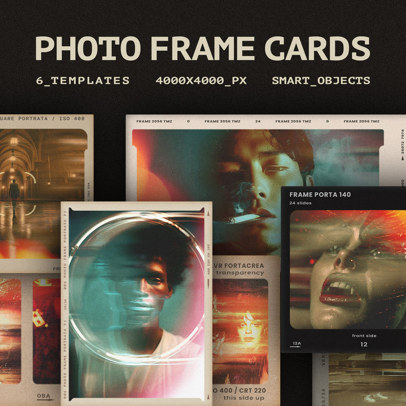 The Frame Cards Photo Effect includes 6 high-quality PSD files at 4000x4000 px and 300 dpi, featuring a black and white option and a help file. This product allows users to easily create realistic mockups by utilizing Smart Object layers for graphic integration. Compatible with Photoshop.