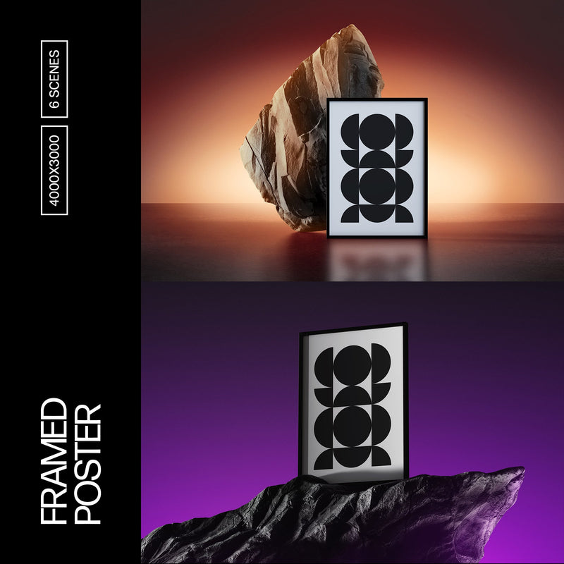 The Framed Poster Mockups Collection is a set of six professional PSD scenes, designed for Photoshop. The collection features customizable mockups with sleek frames, stone textures, neon glows, and laser rays, allowing for easy adjustment of backdrop light color. Each mockup integrates seamlessly into the Smart Object layers for a realistic look. The package includes high-quality PSD files with intuitive lightning editing and a help file.