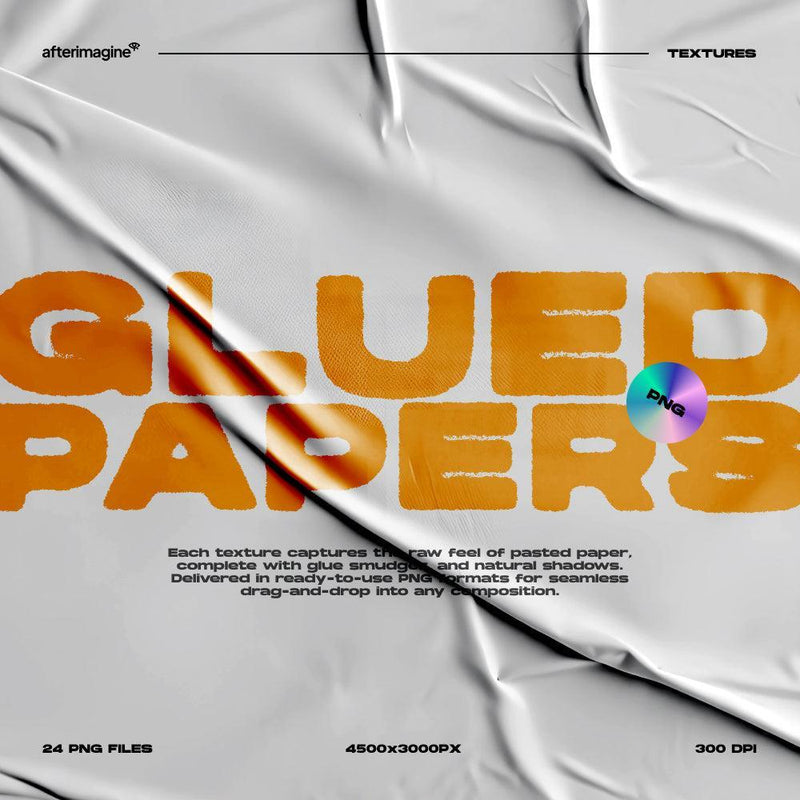 **Glued Papers Textures** is a collection of 24 high-resolution PNG files featuring paper surfaces with glued effects, complete with glue smudges and natural shadows. The package includes a bonus PSD file for easy editing with Smart Objects, all at a resolution of 4500x3000 px and 300 dpi, compatible with Photoshop, Affinity Photo, and InDesign.