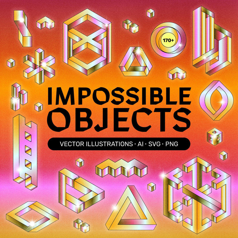 The IMPOSSIBLE Objects + Bonus is a versatile set featuring retro-inspired impossible objects that can be customized with 11 different colourways. The set includes 50 linework, flat coloured, and 3D gradient vector impossible objects, along with bonus vector retro sparkles and sunset gradient backgrounds. It is compatible with Illustrator, Photoshop, Affinity Designer, Figma, Sketch, and Canva.