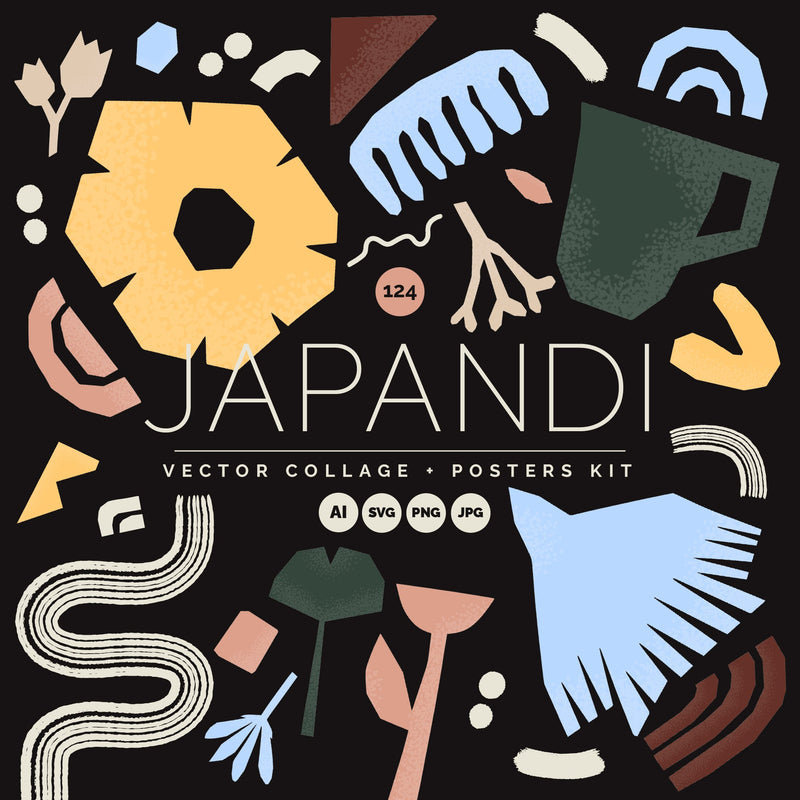 The JAPANDI STUDIO Vector Kit is a contemporary collection of 100 vector elements and 24 premade posters in AI, SVG, and PNG formats, featuring cut out shapes and fresh colourways. The kit includes a detailed tutorial for building your posters and recolouring, and is compatible with Illustrator.
