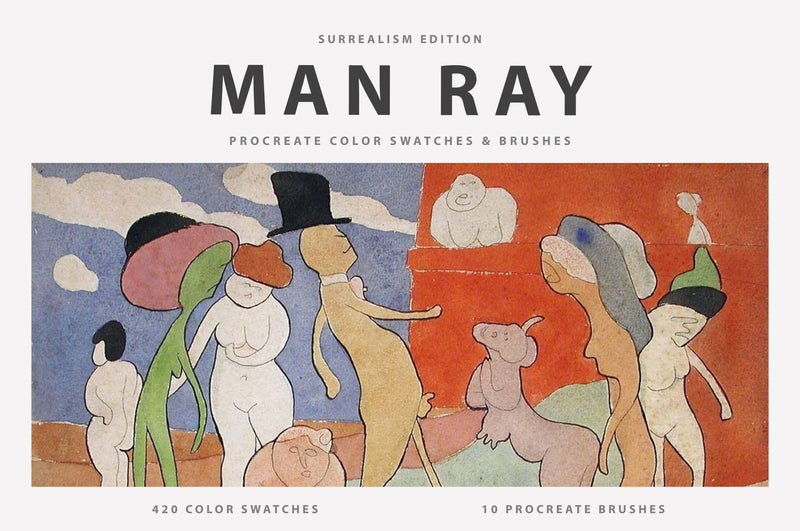 The Man Ray Procreate Kit includes 420 color swatches and 10 brushes inspired by Man Ray's paintings, specifically designed for illustrators and graphic designers. This kit also provides a Spotify playlist link for classical music and offers 24/7 support, all compatible with Procreate.