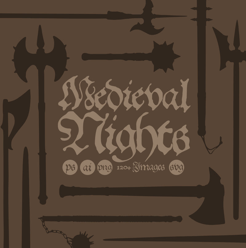 The Medieval Nights Graphics Pack is a collection of over 120 high-resolution vector illustrations, featuring gothic and medieval themes such as ornate skulls and haunting motifs. The pack is compatible with a range of design software including Photoshop, Illustrator, After Effects, Indesign, Procreate, Sketch, Figma, and Canva.