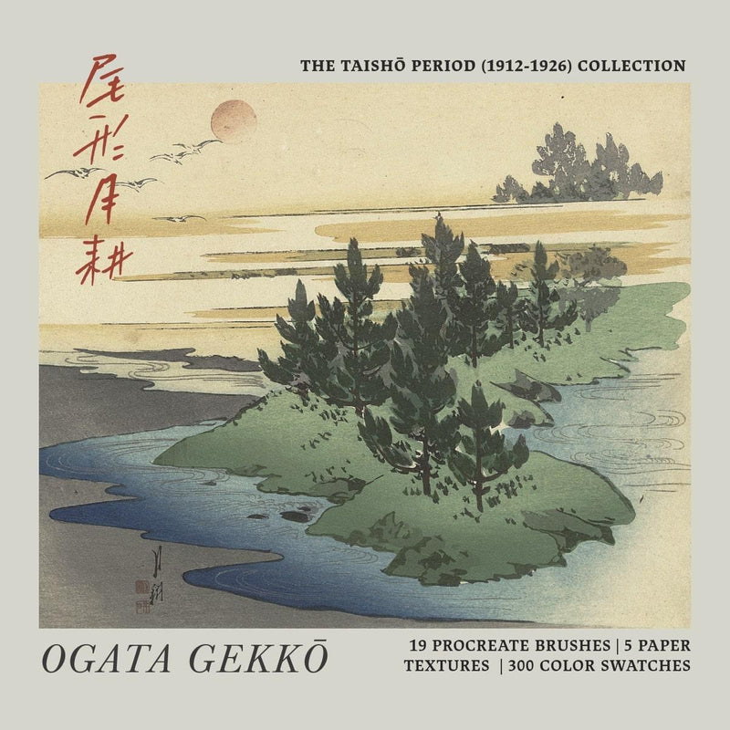 The Ogata Gekko Procreate Kit is a digital resource collection inspired by the Taishō Era of Japanese art, featuring 300 Procreate color swatches, 19 Procreate brushes, and 5 woodblock textures at 800 DPI. This kit allows users to access high-quality tools that reflect the techniques of master artist Ogata Gekkō, compatible with Procreate on iPad.