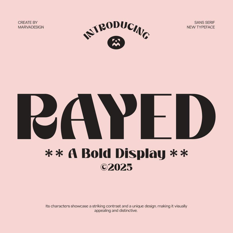 Rayed is a bold display typeface that combines sans-serif elements, featuring a striking contrast and unique design. It is versatile for use in both uppercase and lowercase formats, making it suitable for a variety of design applications.