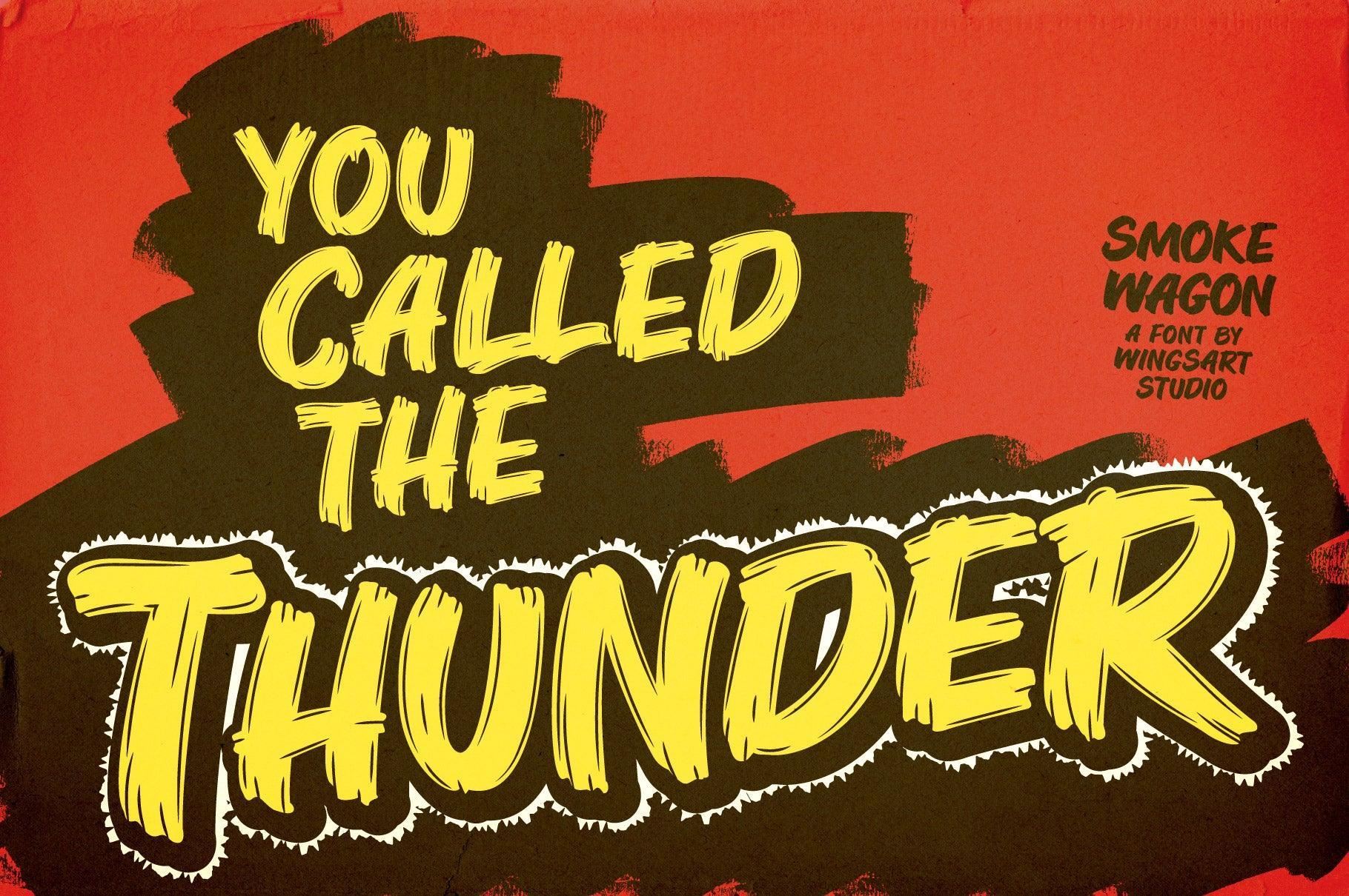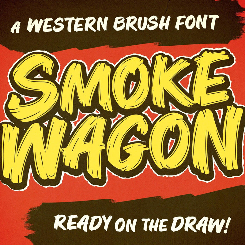 Smoke Wagon is a western brush font that includes a complete set of uppercase and lowercase characters, numerals, punctuation, and symbols, along with an all-caps variant for impactful titles. It features Regular, All Caps, Clean, and Outer versions, as well as an experimental "Rough Justice" variant, all available in OTF, TTF, and WOFF formats.