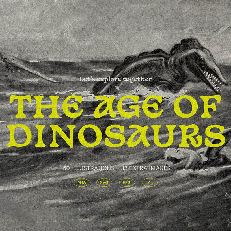 "The Age Of Dinosaurs" is a collection of 150 vectorized dinosaur and fossil illustrations, named for easy reference, and 32 bonus high-resolution images. The package, compatible with Photoshop, Procreate, and Illustrator, includes elements in PNG, EPS, AI, SVG, and JPG formats.