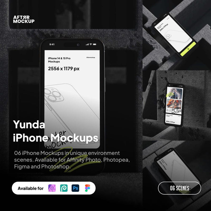 The Yunda iPhone Mockups is a set of six customizable mockup scenes compatible with Photoshop, Affinity Photo, Photopea, and Figma. The product offers high-resolution scenes (4000 x 3000 px) that can be combined with text and images for presentations.