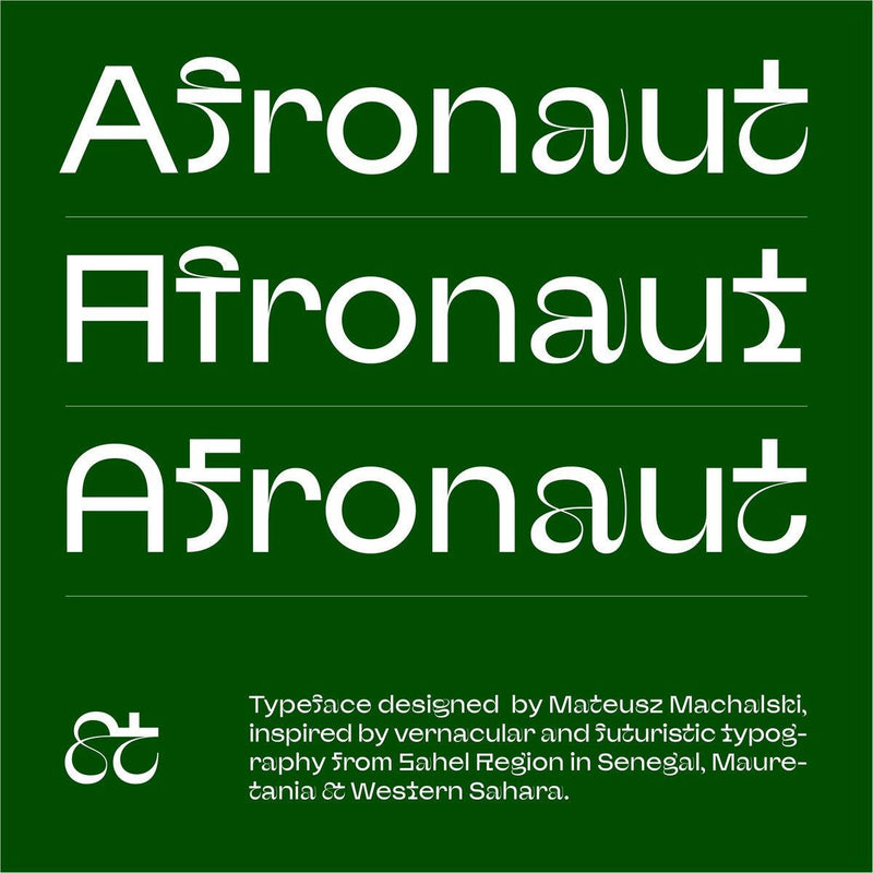 The Afronaut PRO is a unique typeface inspired by vernacular Latin & Arabic typography found in St. Louis on the Senegal-Mauretania Border in Africa. It features a blend of geometric and smooth, round elements, and includes seven weights with many letters having three different forms.
